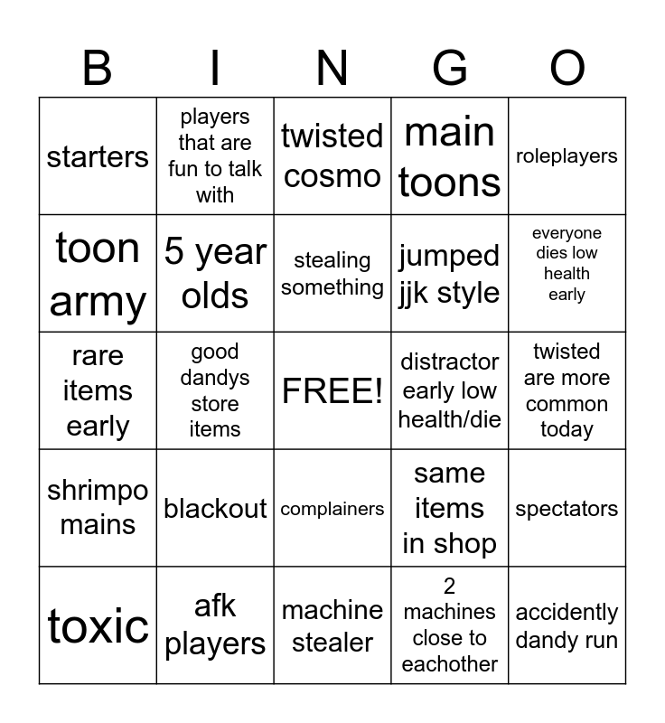 This bingo card has a free space and 24 words: blackout, afk players, stealing something, toxic, roleplayers, starters, toon army, players that are fun to talk with, distractor early low health/die, complainers, jumped jjk style, rare items early, same items in shop, spectators, 5 year olds, 2 machines close to eachother, twisted are more common today, twisted cosmo, everyone dies low health early, good dandys store items, accidently dandy run, shrimpo mains, main toons and machine stealer.