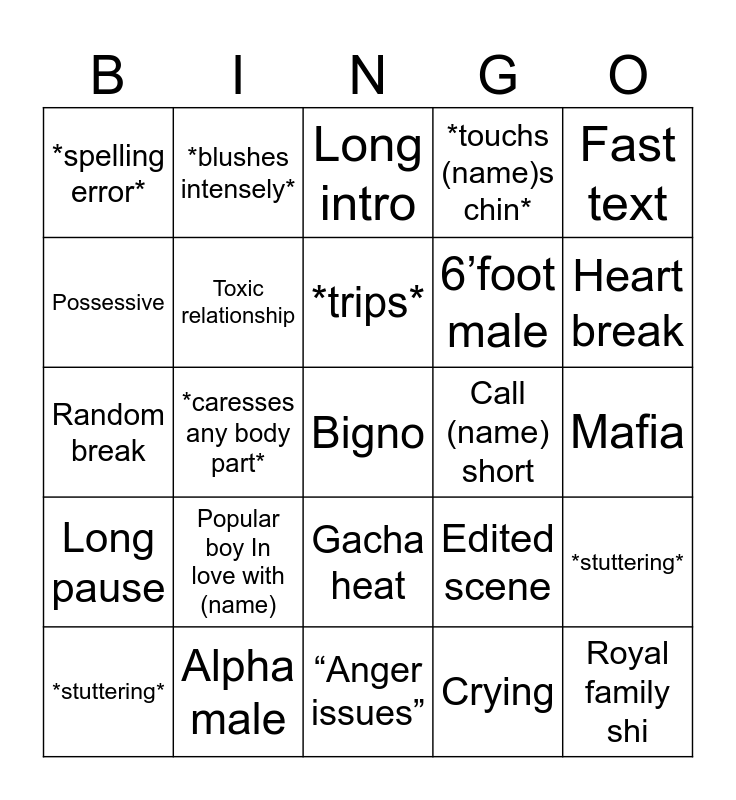 This bingo card has a free space and 29 words: *stuttering*, *blushes intensely *, *caresses any body part*, *trips*, *spelling error*, Long intro, Toxic relationship, Popular boy In love with (name), Call (name) short, Alpha male, Mafia, Royal family shi, “Anger issues”, Crying, Heart break, The character teleports, Gacha heat, Long pause, Fast text, Random break, Edited scene, Betrayal, 6’foot male, Possessive, *touchs (name)s chin*, *blushes intensely*, *stuttering*, *trips* and *acidentally kiss*.