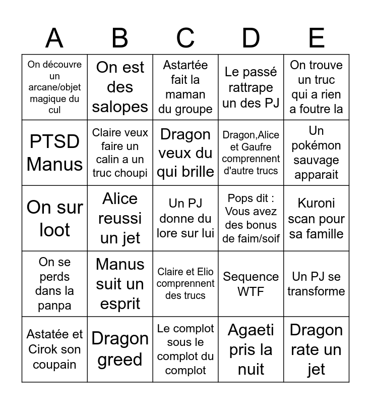 This bingo card has a free space and 24 words: Manus suit un esprit, Dragon greed, Dragon veux du qui brille, Astatée et Cirok son coupain, On trouve un truc qui a rien a foutre la, On découvre un arcane/objet magique du cul, PTSD Manus, On est des salopes, Pops dit : Vous avez des bonus de faim/soif, Claire et Elio comprennent des trucs, Dragon,Alice et Gaufre comprennent d'autre trucs, On sur loot, Sequence WTF, Un PJ se transforme, Claire veux faire un calin a un truc choupi, Agaeti pris la nuit, Kuroni scan pour sa famille, Astartée fait la maman du groupe, Un pokémon sauvage apparait, Alice reussi un jet, Dragon rate un jet, On se perds dans la panpa, Le passé rattrape un des PJ and Le complot sous le complot du complot.