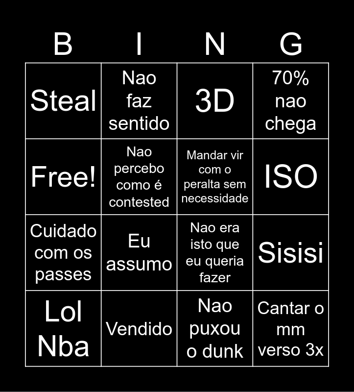 This bingo card has 16 words: Vendido, Sisisi, 3D, Steal, Cuidado com os passes, Nao faz sentido, Nao era isto que eu queria fazer, Nao puxou o dunk, Free!, Nao percebo como é contested, Lol Nba, 70% nao chega, Eu assumo, ISO, Mandar vir com o peralta sem necessidade and Cantar o mm verso 3x.