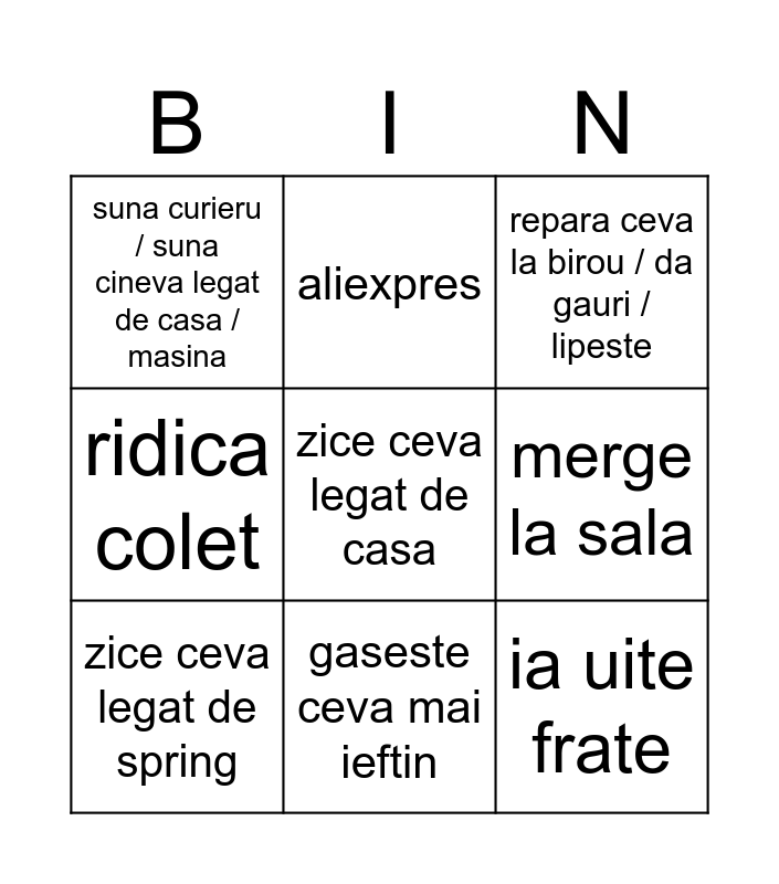 This bingo card has a free space and 8 words: merge la sala, repara ceva la birou / da gauri / lipeste, aliexpres, zice ceva legat de spring, suna curieru / suna cineva legat de casa / masina, ia uite frate, ridica colet and gaseste ceva mai ieftin.