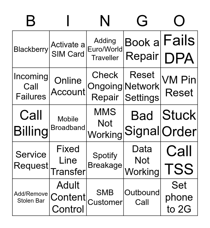 This bingo card has 25 words: Fixed Line Transfer, SMB Customer, Check Ongoing Repair, Add/Remove Stolen Bar, Fails DPA, Blackberry, Incoming Call Failures, Activate a SIM Card, Bad Signal, Spotify Breakage, Reset Network Settings, Call Billing, Data Not Working, Call TSS, Online Account, Set phone to 2G, Stuck Order, Adding Euro/World Traveller, VM Pin Reset, Mobile Broadband, MMS Not Working, Adult Content Control, Service Request, Book a Repair and Outbound Call.