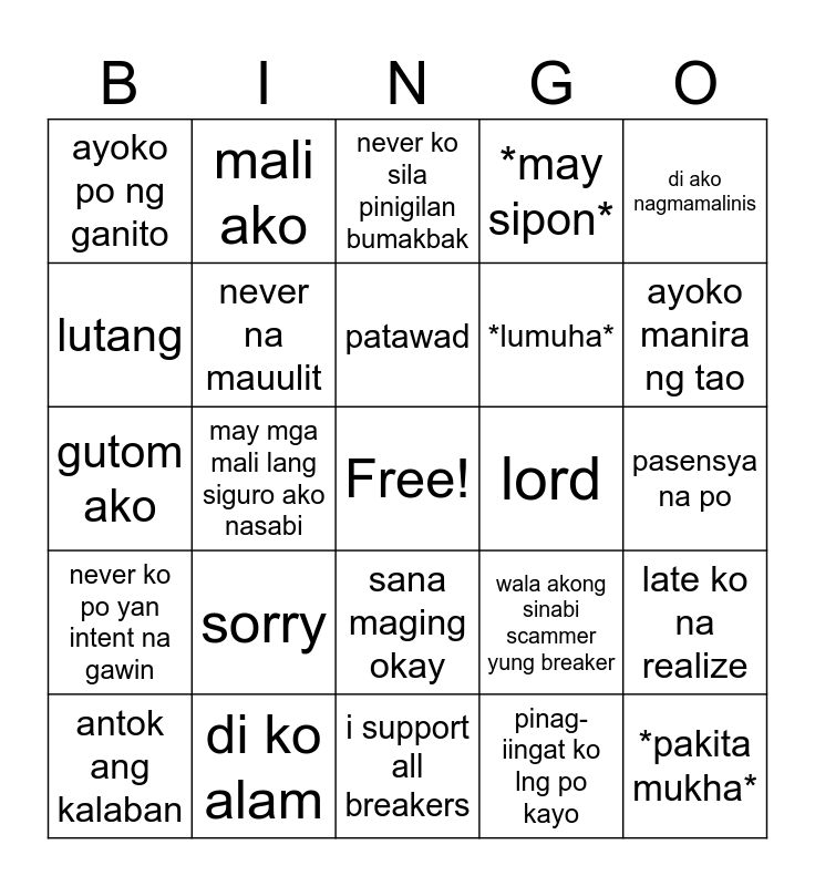 This bingo card has a free space and 24 words: sorry, di ko alam, patawad, antok ang kalaban, di ako nagmamalinis, ayoko po ng ganito, lutang, mali ako, lord, sana maging okay, *lumuha*, gutom ako, wala akong sinabi scammer yung breaker, late ko na realize, never na mauulit, pinag-iingat ko lng po kayo, pasensya na po, never ko sila pinigilan bumakbak, ayoko manira ng tao, may mga mali lang siguro ako nasabi, *pakita mukha*, never ko po yan intent na gawin, *may sipon* and i support all breakers.