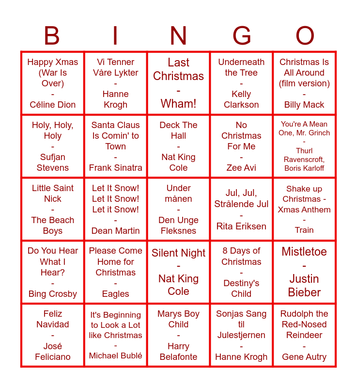 This bingo card has 30 words: It's Beginning to Look a Lot like Christmas - Michael Bublé, Selmas sang (fra Snøfall) - Eva Weel Skram, Let It Snow! Let It Snow! Let it Snow! - Dean Martin, Do They Know It's Christmas? - Band Aid, Happy Xmas (War Is Over) - Céline Dion, Last Christmas - Wham!, Santa Claus Is Comin' to Town - Frank Sinatra, Silent Night - Nat King Cole, Jul, Jul, Strålende Jul - Rita Eriksen, Marys Boy Child - Harry Belafonte, Shake up Christmas - Xmas Anthem - Train, Under månen - Den Unge Fleksnes, Sonjas Sang til Julestjernen - Hanne Krogh, Rudolph the Red-Nosed Reindeer - Gene Autry, You're A Mean One, Mr. Grinch - Thurl Ravenscroft, Boris Karloff, Romjulsdrøm - Alf Prøysen, 8 Days of Christmas - Destiny's Child, Do You Hear What I Hear? - Bing Crosby, Please Come Home for Christmas - Eagles, Christmas Is All Around (film version) - Billy Mack, Little Saint Nick - The Beach Boys, A Holly Jolly Christmas - Burl Ives, Vi Tenner Våre Lykter - Hanne Krogh, No Christmas For Me - Zee Avi, Holy, Holy, Holy - Sufjan Stevens, Underneath the Tree - Kelly Clarkson, Mistletoe - Justin Bieber, Feliz Navidad - José Feliciano, Deck The Hall - Nat King Cole and The Nutcracker Suite - Pyotr IIyich Tchaikovsky, Leonard Bernstein +++++.