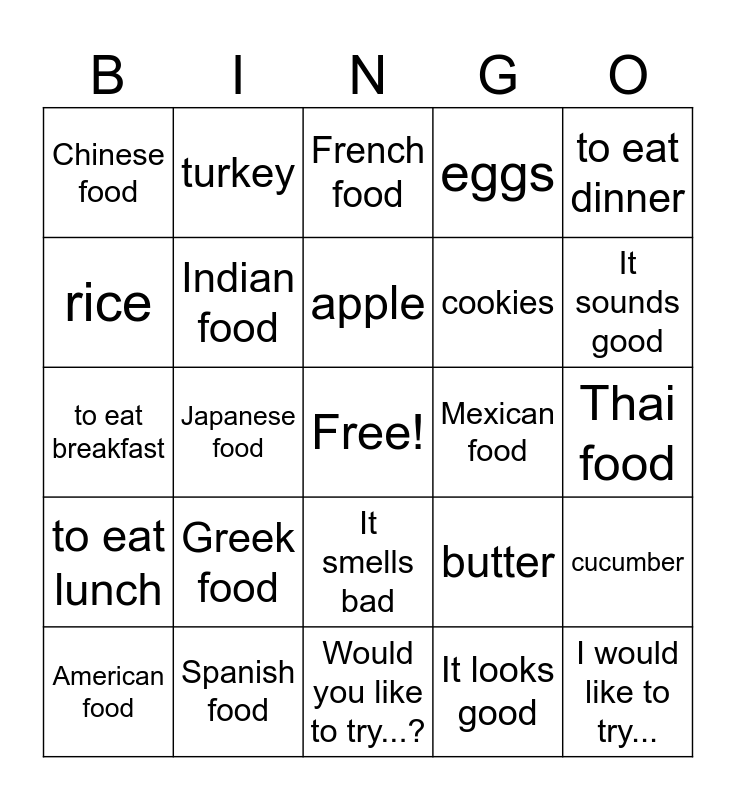 This bingo card has a free space and 29 words: American food, Italian food, Japanese food, Korean food, Chinese food, French food, Indian food, Greek food, Mexican food, Spanish food, Thai food, I would like to try..., Would you like to try...?, It looks good, It sounds good, It smells good, It smells bad, to eat lunch, to eat dinner, to eat breakfast, butter, cheese, cookies, rice, eggs, turkey, cucumber, apple and carrots.