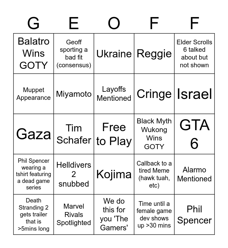 This bingo card has a free space and 35 words: Weird Product Placement, Game Premiere that looks like but is not Bloodborne 2, Switch 2 Teased, Miyamoto, Kojima, Reggie, Muppet Appearance, Awkward Celebrity Cameo, Layoffs Mentioned, Bland Military Shooter Trailer, Gaza, Elder Scrolls 6 talked about but not shown, Day of Show Release Announcement, Warframe Spotlight, Balatro Wins GOTY, Black Myth Wukong Wins GOTY, Time until a female game dev shows up >30 mins, Tim Schafer, Phil Spencer wearing a tshirt featuring a dead game series, Phil Spencer, Callback to a tired Meme (hawk tuah, etc), Death Stranding 2 gets trailer that is >5mins long, Alarmo Mentioned, Marvel Rivals Spotlighted, Ukraine, Israel, Someone does a swear, Call of Duty Spotlight, Cringe, GTA 6, Hollowknight Silksong, We do this for you 'The Gamers', Helldivers 2 snubbed, Geoff sporting a bad fit (consensus) and Mobile Game Spotlight.
