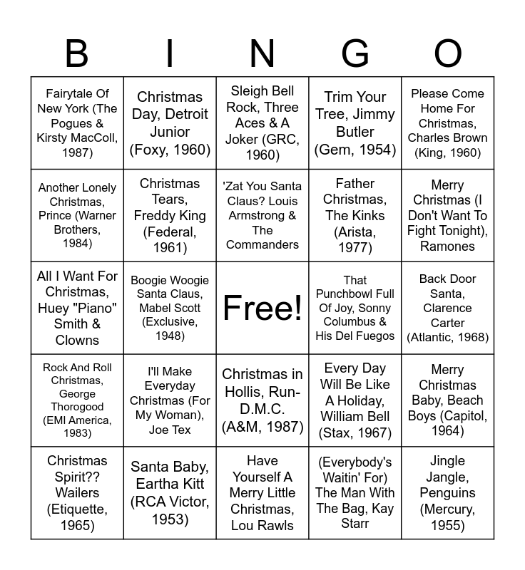 This bingo card has a free space and 100 words: Christmas (Baby Please Come Home), Darlene Love, White Christmas, The Drifters (Atlantic, 1954), Back Door Santa, Clarence Carter (Atlantic, 1968), Run Rudolph Run, Chuck Berry (Chess, 1958), Santa Claus Is Back In Town, Elvis Presley (RCA, 1957), Rudolph The Red Nosed Reindeer, Temptations (Motown, 1968), Happy Xmas (War Is Over), John Lennon & Yoko Ono (Apple, 1971), Merry Christmas Baby, Charles Brown (Aladdin, 1956), Santa Claus Is Coming To Town, Jackson 5 (Motown, 1970), Rockin' Around The Christmas Tree, Brenda Lee (Decca, 1958), Jingle Bell Rock, Bobby Helms (Decca, 1957), Rudolph The Red-Nosed Reindeer, The Ventures (Dolton, 1965), (It's Gonna Be A) Lonely Christmas, The Orioles, Santa Baby, Eartha Kitt (RCA Victor, 1953), Christmas Time's A-Coming, Mac Wiseman (King, circa 1979), Christmas Celebration, B.B. King (Kent, 1962), Father Christmas, The Kinks (Arista, 1977), If We Make It Through December, Merle Haggard (Capitol, 1973), Christmas Celebration, Weezer (Geffen, 2000), Step Into Christmas, Elton John (MCA, 1973), Santa's Rap, Treacherous Three (Atlantic, 1984), Feliz Navi-Nada, El Vez, Someday At Christmas, Stevie Wonder (Motown, 1966), Merry Christmas Baby, Otis Redding (Atco, 1968), Nothing For Christmas, The Reducers (Rave On, 1988), That Punchbowl Full Of Joy, Sonny Columbus & His Del Fuegos, Please Come Home For Christmas, Charles Brown (King, 1960), Every Day Will Be Like A Holiday, William Bell (Stax, 1967), Don't Believe In Christmas, The Sonics (Etiquette, 1965), Who Say There Ain't No Santa Claus, Ron Holden (Donna, 1960), Boogie Woogie Santa Claus, Mabel Scott (Exclusive, 1948), Fairytale Of New York (The Pogues & Kirsty MacColl, 1987), Here Comes Santa Claus, Gene Autry (Columbia, 1947), How I Hate To See Christmas Come Around, Jimmy Witherspoon, (Everybody's Waitin' For) The Man With The Bag, Kay Starr, 'Zat You Santa Claus? Louis Armstrong & The Commanders, Merry Christmas Baby, Beach Boys (Capitol, 1964), Christmas Boogie, Davis Sisters (RCA Victor, 1953), This Christmas, Donny Hathaway (Atco, 1970), Santa Claus Is Coming To Town, The Crystals (Philles, 1963), Christmastime Here (Could Never Be Like That), Wednesday Week, Holiday Spirit, The dB's (East Side Digital, 1993), All I Want For Christmas, Huey "Piano" Smith & Clowns, Christmas Is My Time Of Year, Christmas Spirit, Merry Christmas (I Don't Want To Fight Tonight), Ramones, Sleigh Bell Rock, Three Aces & A Joker (GRC, 1960), Christmas Everyday, Miracles (Motown, 1963), Christmas Will Be Just Another Lonely Day, Brenda Lee, Santa Claus Go Straight To The Ghetto, James Brown, Have Yourself A Merry Little Christmas, Lou Rawls, Cool Yule, Rebel Pebbles (IRS, 1990), Frosty The Snowman, Ronettes (Philles, 1963), (Rockin') Winter Wonderland, Fabulous Thunderbirds, Little Drummer Boy, (Joan Jett, 1981), Presents For Christmas, Solomon Burke (Atlantic, 1966), Santa's Got A GTO, Ramonas (self-released, 1990), Hey Santa Claus, Moonglows (Chance, 1953), 2000 Miles, Pretenders (Sire, 1983), 'Twas The Night Before Christmas, Snoop Dogg with Nate Dogg, Trim Your Tree, Jimmy Butler (Gem, 1954), C-H-R-I-S-T-M-A-S, Yobs (Safari, 1980), Santa & The Satellite (Parts 1 & 2), Buchanan & Goodman, You're A Mean One Mr. Grinch, Thurl Ravenscroft, Christmas Wrapping, Waitresses (Ze, 1981), Gee Whiz, It's Christmas, Carla Thomas (Atlantic, 1963), I'll Be Your Santa Baby, Rufus Thomas (Stax, 1973), Christmas In Jail, Youngsters (Empire, 1956), Santa Looked A Lot Like Daddy, Buck Owens (Capitol, 1965), If I Get Home On Christmas Day, Elvis Presley (RCA, 1971), Marshmallow World, Los Straitjackets (Upstart, 1996), The Christmas Song (Chestnuts Roasting On An Open Fire), I'll Make Everyday Christmas (For My Woman), Joe Tex, Who Took The Merry Out Of Christmas, Staple Singers, Lonesome Christmas, Lowell Fulson (Swing Time, 1950), All I Want For Christmas (Is My Two Front Teeth), Spike Jones, Nuttin' For Christmas, Joe Ward (King, 1955), It's Christmas, Marvin & Johnny (Aladdin, 1958), Another Lonely Christmas, Prince (Warner Brothers, 1984), Christmas Spirits (aka Christmas Blues), What Are You Doing New Year's Eve? Orioles (Jubilee, 1949), I Saw Mommy Kissing Santa Claus, John Mellencamp (A&M, 1987), Jingle Jangle, Penguins (Mercury, 1955), Christmas Is The Time To Say I Love You, Billy Squier, Christmas in Hollis, Run-D.M.C. (A&M, 1987), Santa Claus Is Coming, Hank Ballard & The Midnighters, Christmas Day, Detroit Junior (Foxy, 1960), Santa Claus Is Coming To My House, Karla DeVito, (Epic, 1982), Dear Santa (Bring Me A Man This Christmas), Weather Girls, Light of the Stable, Emmylou Harris (Reprise, 1979), Rock And Roll Christmas, George Thorogood (EMI America, 1983), Christmas Time, Chris Stamey Group with the dB's and Syd Straw, Christmas In The Congo, Marquees (Warner Brothers, 1959), Twistin' Bells, Santo & Johnny (Canadian American, 1960), Christmas Spirit?? Wailers (Etiquette, 1965), Christmas Tears, Freddy King (Federal, 1961), Santa Claus Wants Some Lovin', Albert King (Stax, 1974), Christmas (Comes But Once a Year), Amos Milburn (King, 1960), Santa & The Sidewalk Surfer, Crossfires (none, 1963), Reindeer Boogie, Hank Snow, (RCA Victor, 1953) and Away In A Manger, Plankeye (BEC, 1998).