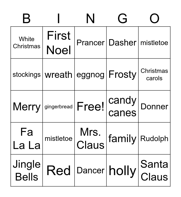 This bingo card has a free space and 53 words: Merry Christmas, Santa Claus, Grinch, holly, mistletoe, garland, First Noel, elves, stockings, Christmas tree, wreath, North Pole, Rudolph, family, sleigh, Jingle Bells, eggnog, candy canes, lights, mistletoe, gingerbread, ornaments, Frosty, White Christmas, Green, Red, Polar Express, hot chocolate, Christmas bell, Christmas carols, Christmas cookies, chimney, December, gifts, snowman, flannel, Dasher, Dancer, Prancer, Vixen, Comet, Cupid, Donner, Blitzen, Ho Ho Ho, Mrs. Claus, jolly, believe, Merry, Fa La La, Joy, nice and naughty.