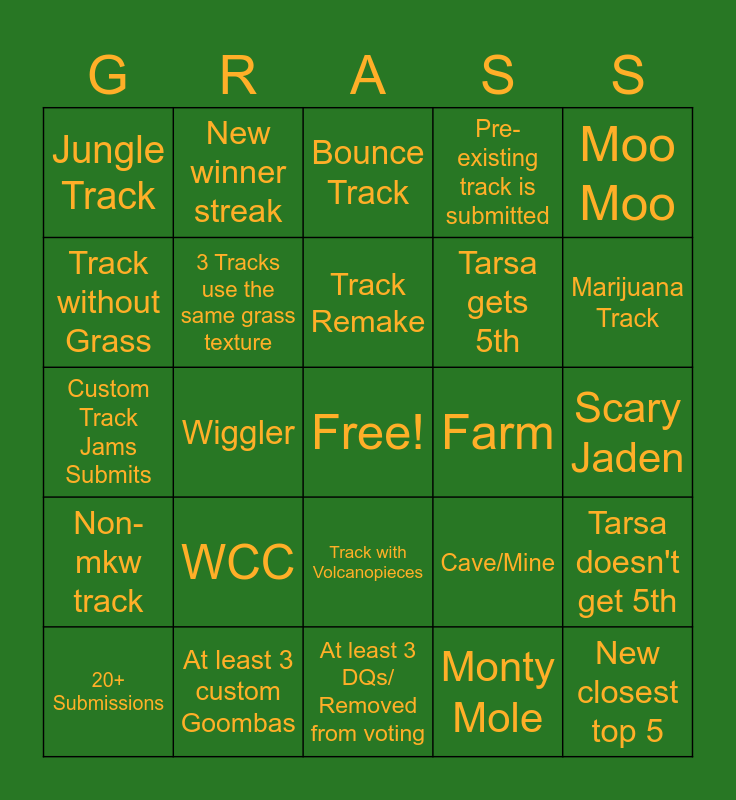 This bingo card has a free space and 24 words: WCC, At least 3 custom Goombas, Track Remake, 20+ Submissions, Moo Moo, Jungle Track, Track without Grass, New winner streak, Farm, Track with Volcanopieces, Tarsa gets 5th, Custom Track Jams Submits, Cave/Mine, Tarsa doesn't get 5th, 3 Tracks use the same grass texture, Monty Mole, Scary Jaden, Bounce Track, Marijuana Track, Wiggler, New closest top 5, Non-mkw track, Pre-existing track is submitted and At least 3 DQs/ Removed from voting.