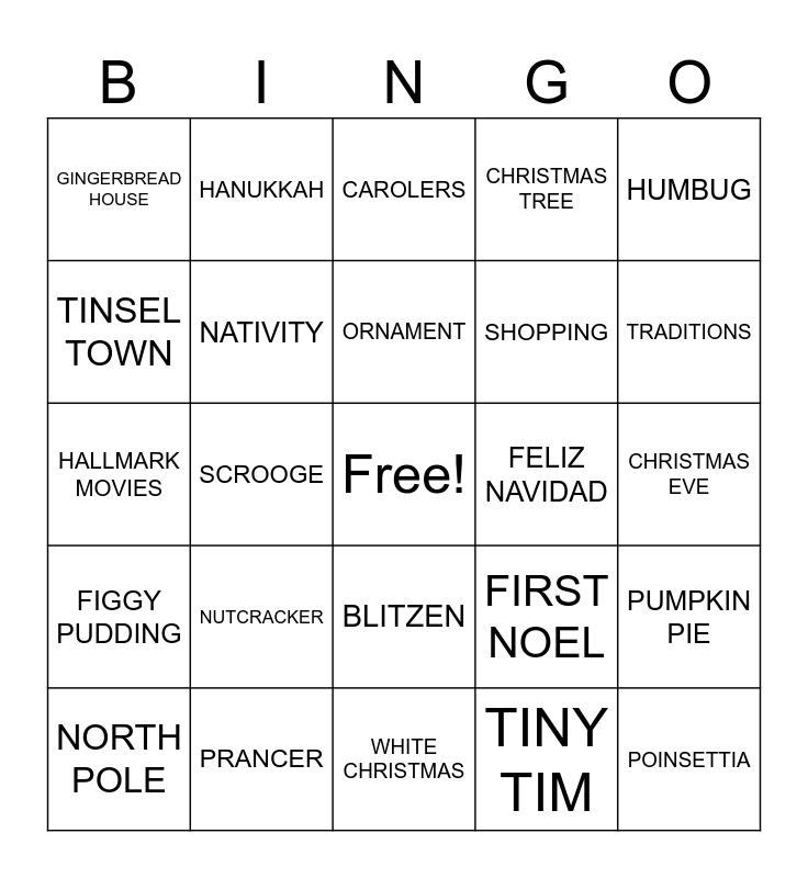 This bingo card has a free space and 75 words: MISTLETOE, SLEIGH, CAROLERS, ST. NICK, HOLLY, SNOWFLAKES, RUDOLPH, FROSTY, FESTIVE, YULE LOG, WREATH, CANDY CANE, ORNAMENT, TINSEL TOWN, STOCKINGS, SCROOGE, ANGEL TREE, POINSETTIA, FRUITCAKE, HUMBUG, 12 DAYS, HALLMARK MOVIES, NATIVITY, HANUKKAH, CHRISTMAS TREE, KWANZAA, BUDDY THE ELF, PRESENTS, GRINCH, POLAR EXPRESS, JOLLY, MIRACLE ON 34th STREET, GARLAND, FIRST NOEL, TRADITIONS, SHOPPING, FAMILY, DECEMBER 25th, CHRISTMAS EVE, TINY TIM, MENORAH, ADVENT, TWO TURTLE DOVES, FRANKINCENSE, KRIS KRINGLE, JACK FROST, NORTH POLE, GINGERBREAD HOUSE, REINDEER, SANTA'S WORKSHOP, GLAD TIDINGS, BLITZEN, ICE SKATING, BELL RINGING, LIL DRUMMER BOY, NAUGHTY OR NICE, WINTER WONDERLAND, CHESTNUTS, CHIMNEY, FESTIVUS, NUTCRACKER, THE ROCKETTES, SUGARPLUM, DECK THE HALLS, JINGLE BELLS, FELIZ NAVIDAD, MELE KALIKIMAKA, GREETING CARDS, EGGNOG, PUMPKIN PIE, FIGGY PUDDING, PRANCER, THREE FRENCH HENS, WHITE CHRISTMAS and UGLY SWEATER.