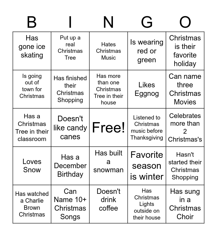 This bingo card has a free space and 24 words: Has a December Birthday, Can Name 10+ Christmas Songs, Has more than one Christmas Tree in their house, Has watched a Charlie Brown Christmas, Christmas is their favorite holiday, Has gone ice skating, Is going out of town for Christmas, Put up a real Christmas Tree, Listened to Christmas music before Thanksgiving, Has built a snowman, Likes Eggnog, Has a Christmas Tree in their classroom, Favorite season is winter, Hasn't started their Christmas Shopping, Has finished their Christmas Shopping, Has Christmas Lights outside on their house, Celebrates more than 2 Christmas's, Hates Christmas Music, Can name three Christmas Movies, Doesn't like candy canes, Has sung in a Christmas Choir, Loves Snow, Is wearing red or green and Doesn't drink coffee.