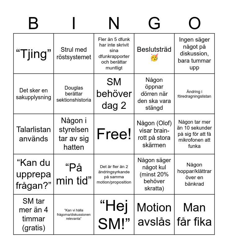 This bingo card has a free space and 24 words: “På min tid”, “Kan vi hålla frågorna/diskussionen relevanta”, SM behöver dag 2, SM tar mer än 4 timmar (gratis), Ingen säger något på diskussion, bara tummar upp, “Tjing”, Det sker en sakupplysning, Strul med röstsystemet, Någon (Olof) visar brain-rott på stora skärmen, Det är fler än 2 ändringsyrkande på samma motion/proposition, Någon öppnar dörren när den ska vara stängd, Talarlistan används, Någon säger något kul (minst 20% behöver skratta), Någon hoppar/klättrar över en bänkrad, Douglas berättar sektionshistoria, Motion avslås, Någon tar mer än 10 sekunder på sig för att få mikrofonen att funka, Fler än 5 dfunk har inte skrivit sina dfunkrapporter och berättar muntligt, Ändring i föredragningslistan, Någon i styrelsen tar av sig hatten, Man får fika, “Kan du upprepa frågan?”, Beslutsträd 🥳 and “Hej SM!”.