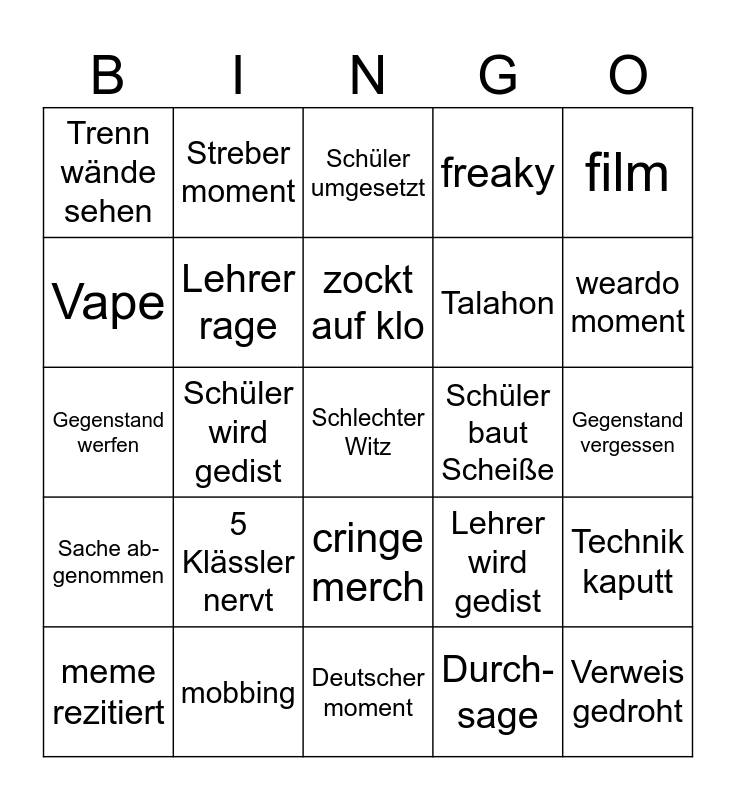 This bingo card has a free space and 24 words: 5 Klässler nervt, mobbing, zockt auf klo, meme rezitiert, film, Trenn wände sehen, Vape, Streber moment, Schüler baut Scheiße, cringe merch, Talahon, Gegenstand werfen, Lehrer wird gedist, Technik kaputt, Lehrer rage, Durch- sage, Gegenstand vergessen, Schüler umgesetzt, weardo moment, Schüler wird gedist, Verweis gedroht, Sache ab- genommen, freaky and Deutscher moment.