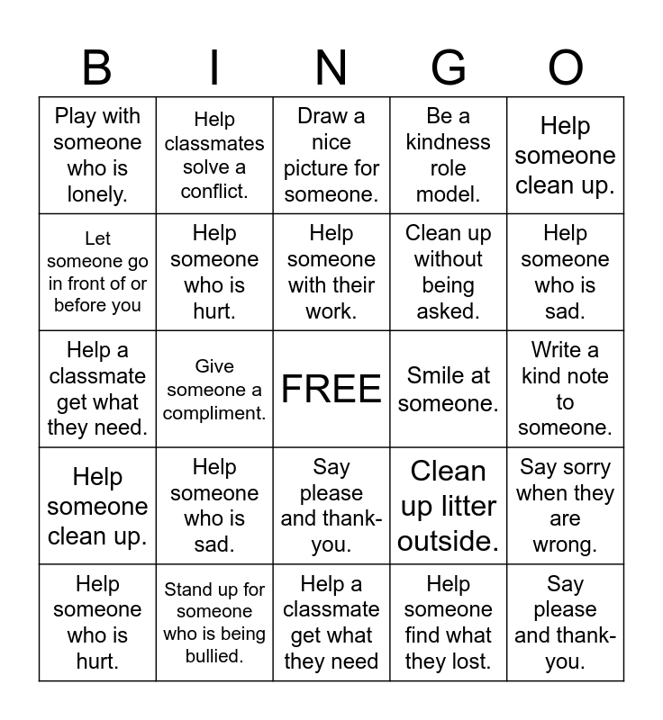 This bingo card has a free space and 24 words: Help someone who is sad., Stand up for someone who is being bullied., Help someone with their work., Help someone who is hurt., Help someone clean up., Play with someone who is lonely., Let someone go in front of or before you, Help classmates solve a conflict., Smile at someone., Say please and thank-you., Clean up without being asked., Help a classmate get what they need., Clean up litter outside., Say sorry when they are wrong., Help someone who is hurt., Help someone find what they lost., Write a kind note to someone., Draw a nice picture for someone., Help someone who is sad., Give someone a compliment., Say please and thank-you., Help someone clean up., Be a kindness role model. and Help a classmate get what they need.