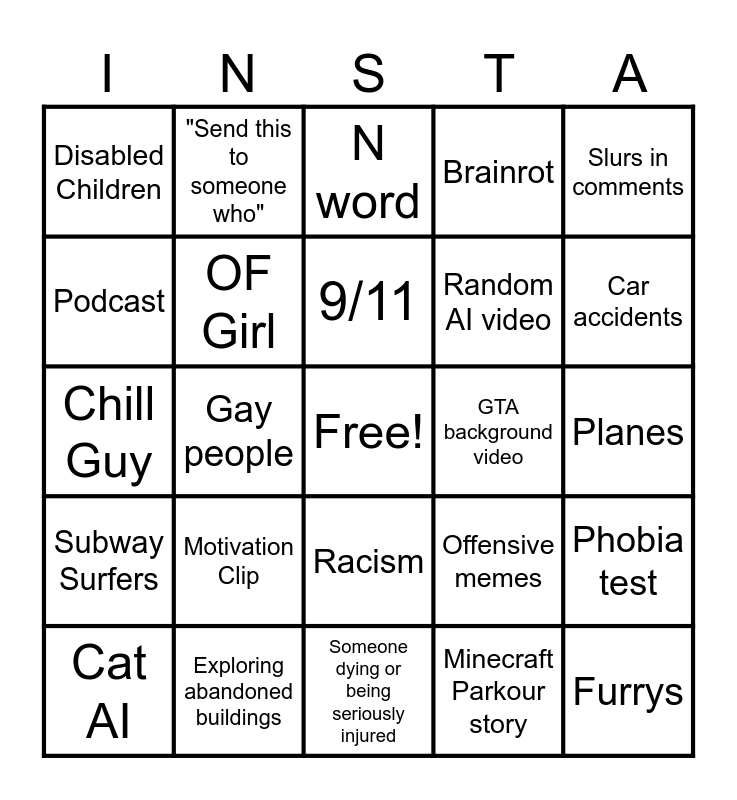 This bingo card has a free space and 24 words: Motivation Clip, Exploring abandoned buildings, 9/11, Cat AI, Slurs in comments, Disabled Children, Podcast, "Send this to someone who", GTA background video, Racism, Random AI video, Chill Guy, Offensive memes, Phobia test, OF Girl, Minecraft Parkour story, Planes, N word, Car accidents, Gay people, Furrys, Subway Surfers, Brainrot and Someone dying or being seriously injured.