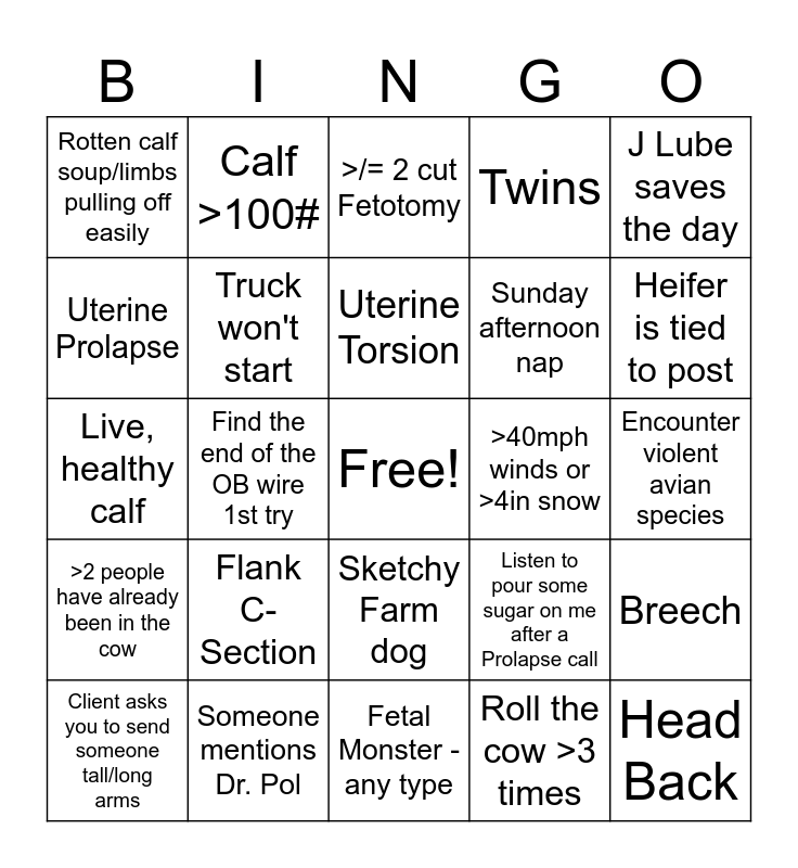 This bingo card has a free space and 24 words: Client asks you to send someone tall/long arms, Flank C-Section, Uterine Torsion, Roll the cow >3 times, J Lube saves the day, Rotten calf soup/limbs pulling off easily, Calf >100#, >/= 2 cut Fetotomy, >40mph winds or >4in snow, Encounter violent avian species, Live, healthy calf, Truck won't start, Listen to pour some sugar on me after a Prolapse call, Breech, Uterine Prolapse, Someone mentions Dr. Pol, Fetal Monster - any type, Twins, Heifer is tied to post, >2 people have already been in the cow, Find the end of the OB wire 1st try, Sketchy Farm dog, Sunday afternoon nap and Head Back.