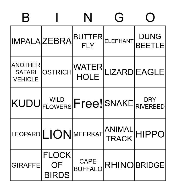 This bingo card has a free space and 24 words: LION, FLOCK OF BIRDS, WATER HOLE, GIRAFFE, DUNG BEETLE, IMPALA, ANOTHER SAFARI VEHICLE, ZEBRA, SNAKE, MEERKAT, LIZARD, KUDU, ANIMAL TRACK, HIPPO, OSTRICH, RHINO, DRY RIVERBED, BUTTER FLY, EAGLE, WILD FLOWERS, BRIDGE, LEOPARD, ELEPHANT and CAPE BUFFALO.