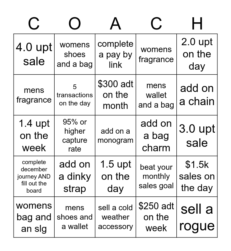 This bingo card has a free space and 24 words: add on a dinky strap, mens shoes and a wallet, $300 adt on the month, womens bag and an slg, 2.0 upt on the day, 4.0 upt sale, mens fragrance, womens shoes and a bag, add on a bag charm, 1.5 upt on the day, mens wallet and a bag, 1.4 upt on the week, beat your monthly sales goal, $1.5k sales on the day, 5 transactions on the day, $250 adt on the week, 3.0 upt sale, complete a pay by link, add on a chain, 95% or higher capture rate, sell a rogue, complete december journey AND fill out the board, womens fragrance and sell a cold weather accessory.