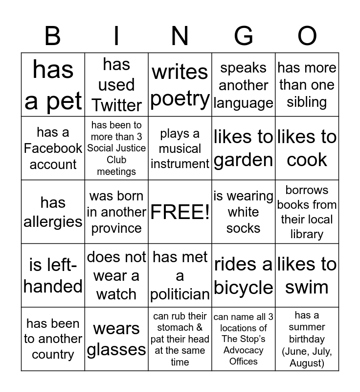 This bingo card has a free space and 24 words: does not wear a watch, wears glasses, plays a musical instrument, has been to another country, has more than one sibling, has a pet, has a Facebook account, has used Twitter, is wearing white socks, has met a politician, likes to garden, has allergies, rides a bicycle, likes to swim, has been to more than 3 Social Justice Club meetings, can name all 3 locations of The Stop’s Advocacy Offices, borrows books from their local library, writes poetry, likes to cook, was born in another province, has a summer birthday (June, July, August), is left-handed, speaks another language and can rub their stomach & pat their head at the same time.