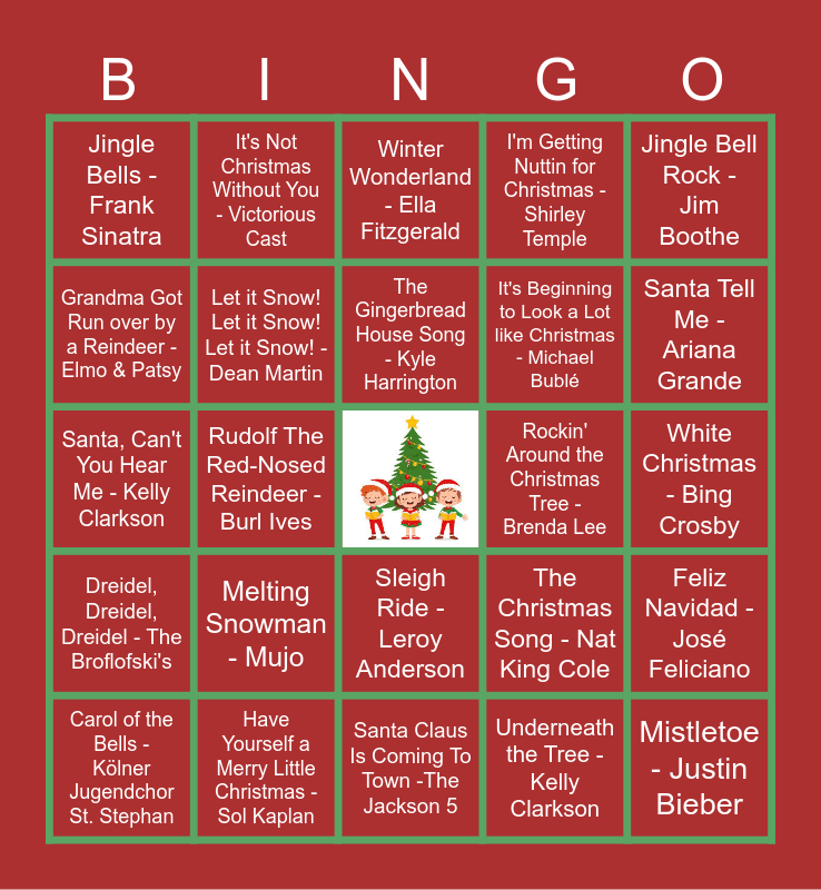 This bingo card has a free space and 31 words: Santa Claus Is Coming To Town -The Jackson 5, Holly Jolly Christmas - Michael Bublé, Rudolf The Red-Nosed Reindeer - Burl Ives, Frosty the Snowman - Gene Autry, Jingle Bells - Frank Sinatra, Winter Wonderland - Ella Fitzgerald, Let it Snow! Let it Snow! Let it Snow! - Dean Martin, The Christmas Song - Nat King Cole, Rockin' Around the Christmas Tree - Brenda Lee, Underneath the Tree - Kelly Clarkson, White Christmas - Bing Crosby, Mistletoe - Justin Bieber, Christmas Time - The Darkness, All I want for Christmas is You - Mariah Carey, Santa Tell Me - Ariana Grande, Last Christmas - Wham!, Feliz Navidad - José Feliciano, Melting Snowman - Mujo, Dreidel, Dreidel, Dreidel - The Broflofski's, Sleigh Ride - Leroy Anderson, Jingle Bell Rock - Jim Boothe, It's a Marshmallow World - Jo Stafford, Carol of the Bells - Kölner Jugendchor St. Stephan, It's Not Christmas Without You - Victorious Cast, It's Beginning to Look a Lot like Christmas - Michael Bublé, Grandma Got Run over by a Reindeer - Elmo & Patsy, I'm Getting Nuttin for Christmas - Shirley Temple, Santa, Can't You Hear Me - Kelly Clarkson, Have Yourself a Merry Little Christmas - Sol Kaplan, The Gingerbread House Song - Kyle Harrington and Joy to the World - Rodaviva Ensemble.