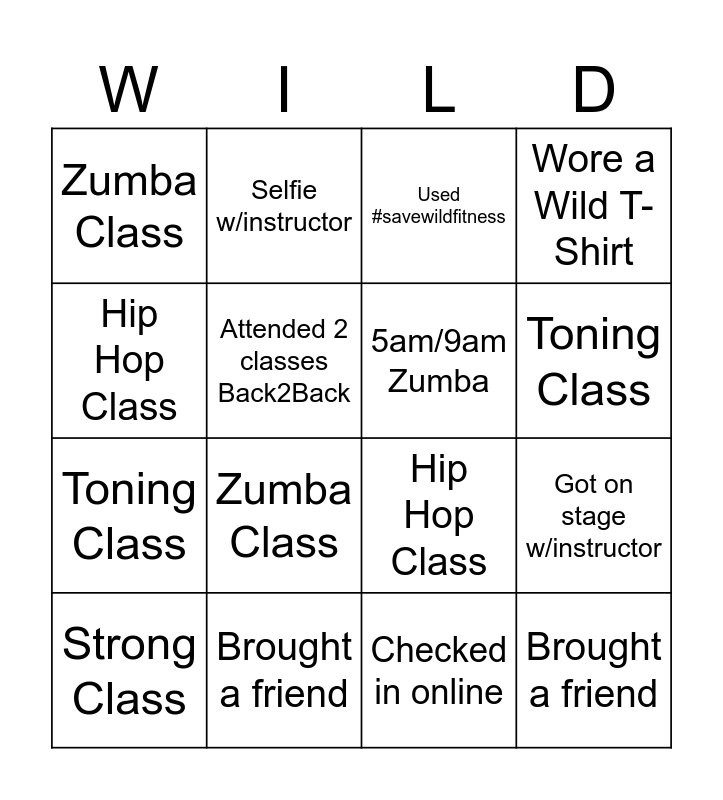 This bingo card has 16 words: Brought a friend, Got on stage w/instructor, Used #savewildfitness, Zumba Class, Toning Class, Selfie w/instructor, Hip Hop Class, Checked in online, Hip Hop Class, Attended 2 classes Back2Back, Strong Class, Wore a Wild T-Shirt, Zumba Class, Toning Class, 5am/9am Zumba and Brought a friend.