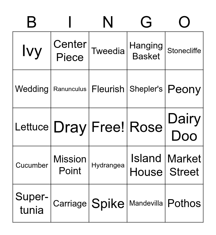 This bingo card has a free space and 29 words: Super-tunia, Daisy, Dray, PW, Ivy, Tweedia, Ranunculus, Mission Point, Rose, Carriage, Dairy Doo, Pothos, Spike, Mandevilla, Peony, Tomato, Hydrangea, Cucumber, Stonecliffe, Lettuce, Island House, Baker Fern, Shepler's, Wedding, Hanging Basket, Center Piece, Market Street, Fleurish and Chippewa.