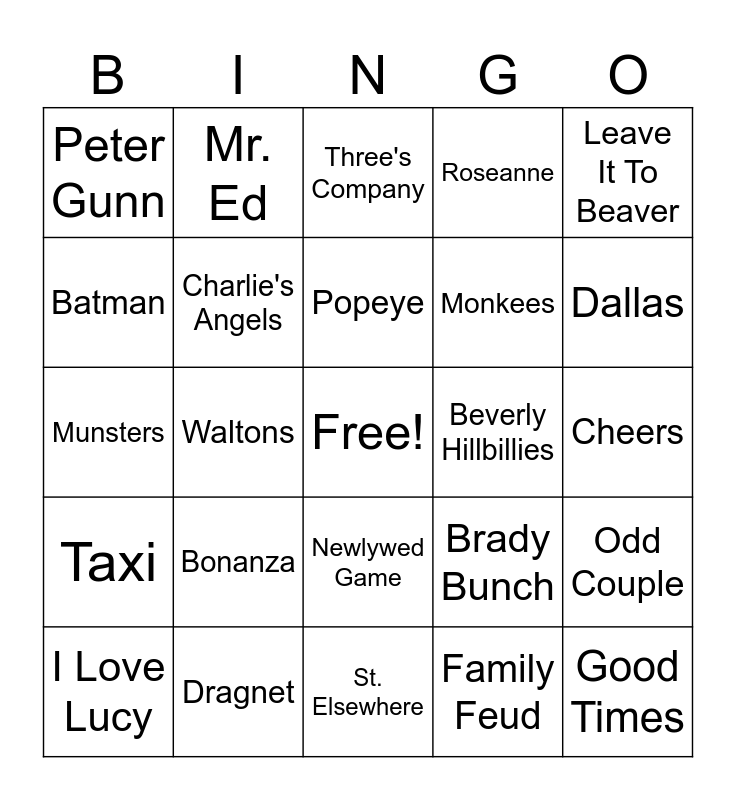 This bingo card has a free space and 24 words: Bonanza, Dragnet, Popeye, I Love Lucy, Leave It To Beaver, Peter Gunn, Batman, Mr. Ed, Beverly Hillbillies, Newlywed Game, Monkees, Munsters, Brady Bunch, Odd Couple, Charlie's Angels, Family Feud, Cheers, Three's Company, Dallas, Waltons, Good Times, Taxi, Roseanne and St. Elsewhere.