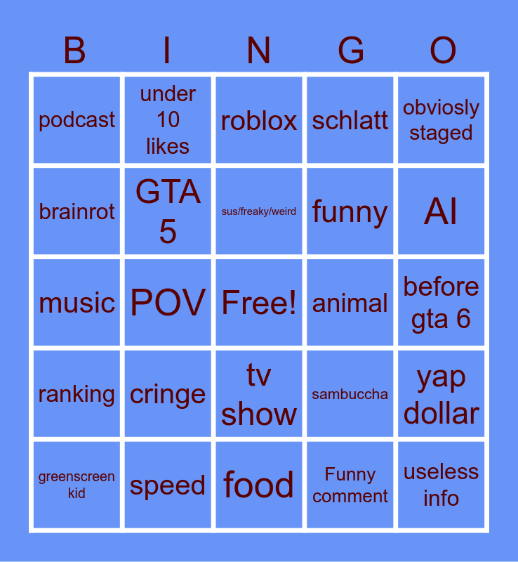 This bingo card has a free space and 24 words: cringe, speed, sus/freaky/weird, greenscreen kid, obviosly staged, podcast, brainrot, under 10 likes, animal, tv show, funny, music, sambuccha, yap dollar, GTA 5, Funny comment, before gta 6, roblox, AI, POV, useless info, ranking, schlatt and food.