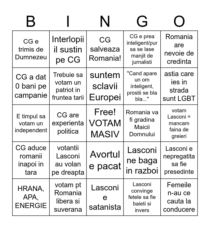 This bingo card has a free space and 24 words: votantii Lasconi au volan pe dreapta, votam pt Romania libera si suverana, suntem sclavii Europei, HRANA, APA, ENERGIE, Romania are nevoie de credinta, CG e trimis de Dumnezeu, CG a dat 0 bani pe campanie, Interlopii il sustin pe CG, Romania va fi gradina Maicii Domnului, Avortul e pacat, "Cand apare un om inteligent, prostii se bla bla...", E timpul sa votam un independent, Lasconi ne baga in razboi, Lasconi e nepregatita sa fie presedinte, Trebuie sa votam un patriot in fruntea tarii, Lasconi convinge fetele sa fie baieti si invers, votam Lasconi = mancam faina de greieri, CG salveaza Romania!, astia care ies in strada sunt LGBT, CG are experienta politica, Femeile n-au ce cauta la conducere, CG aduce romanii inapoi in tara, CG e prea inteligent/pur sa se lase manjit de jurnalisti and Lasconi e satanista.