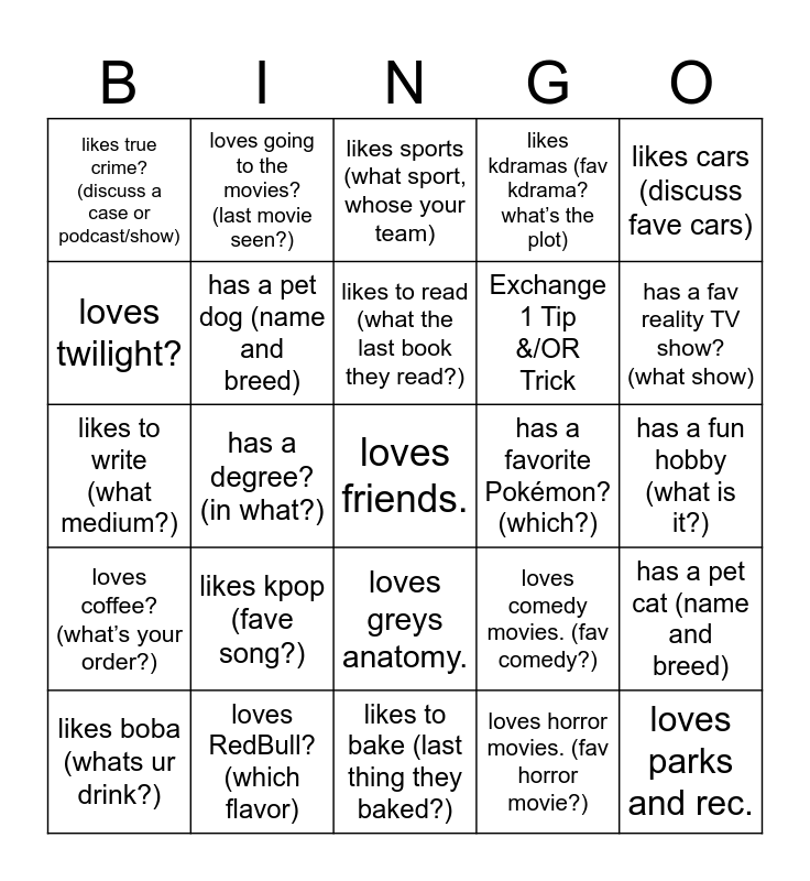 This bingo card has 25 words: likes kpop (fave song?), likes to bake (last thing they baked?), likes to read (what the last book they read?), likes boba (whats ur drink?), likes cars (discuss fave cars), likes true crime? (discuss a case or podcast/show), loves twilight?, loves going to the movies? (last movie seen?), has a favorite Pokémon? (which?), loves greys anatomy., Exchange 1 Tip &/OR Trick, likes to write (what medium?), loves comedy movies. (fav comedy?), has a pet cat (name and breed), has a pet dog (name and breed), loves parks and rec., has a fun hobby (what is it?), likes sports (what sport, whose your team), has a fav reality TV show? (what show), has a degree? (in what?), loves friends., loves RedBull? (which flavor), loves coffee? (what’s your order?), likes kdramas (fav kdrama? what’s the plot) and loves horror movies. (fav horror movie?).