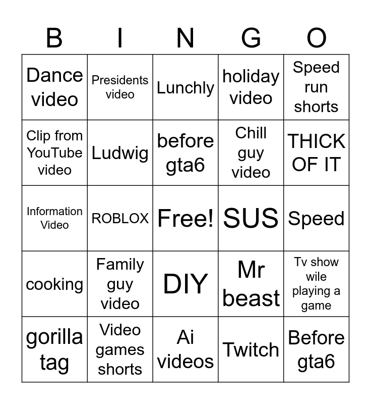 This bingo card has a free space and 24 words: Family guy video, Video games shorts, before gta6, gorilla tag, Speed run shorts, Dance video, Clip from YouTube video, Presidents video, SUS, DIY, Chill guy video, Information Video, Mr beast, Tv show wile playing a game, Ludwig, Twitch, Speed, Lunchly, THICK OF IT, ROBLOX, Before gta6, cooking, holiday video and Ai videos.