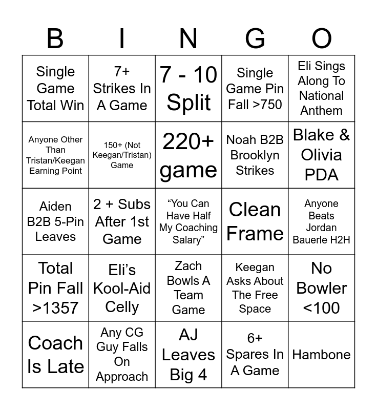 This bingo card has 25 words: Eli’s Kool-Aid Celly, AJ Leaves Big 4, 220+ game, Coach Is Late, Eli Sings Along To National Anthem, Single Game Total Win, Anyone Other Than Tristan/Keegan Earning Point, 7+ Strikes In A Game, Clean Frame, Zach Bowls A Team Game, Noah B2B Brooklyn Strikes, Aiden B2B 5-Pin Leaves, Keegan Asks About The Free Space, No Bowler <100, 150+ (Not Keegan/Tristan) Game, Hambone, Anyone Beats Jordan Bauerle H2H, 7 - 10 Split, Blake & Olivia PDA, 2 + Subs After 1st Game, “You Can Have Half My Coaching Salary”, Any CG Guy Falls On Approach, Total Pin Fall >1357, Single Game Pin Fall >750 and 6+ Spares In A Game.