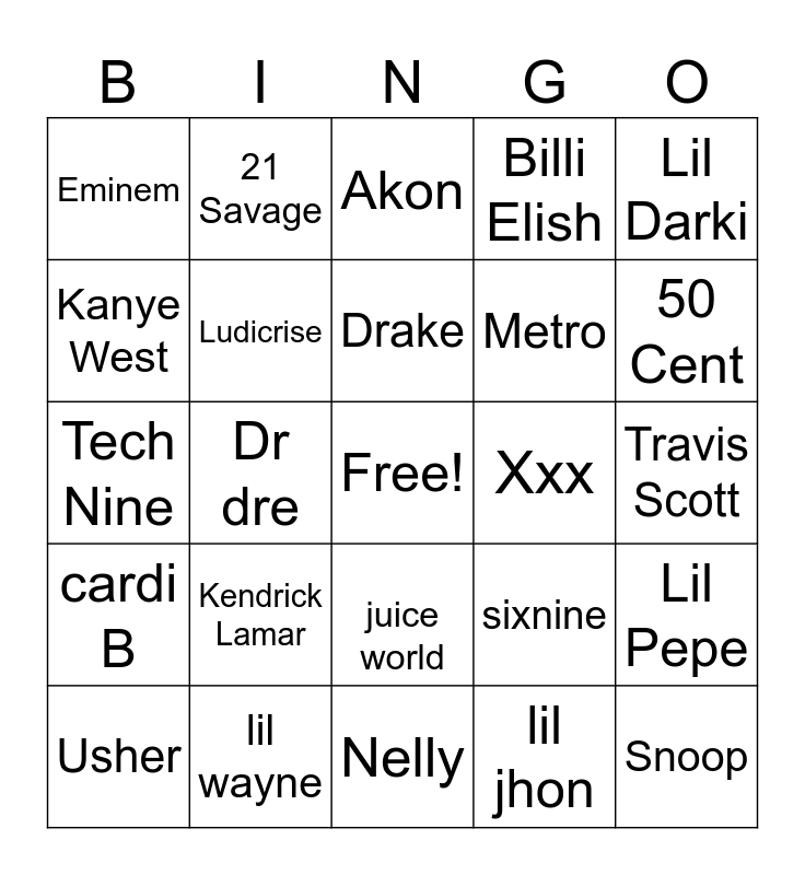 This bingo card has a free space and 24 words: Kendrick Lamar, lil wayne, Drake, Usher, Lil Darki, Eminem, Kanye West, 21 Savage, Xxx, juice world, Metro, Tech Nine, sixnine, Lil Pepe, Ludicrise, lil jhon, Travis Scott, Akon, 50 Cent, Dr dre, Snoop, cardi B, Billi Elish and Nelly.