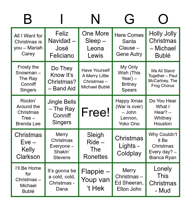 This bingo card has a free space and 73 words: 2000 Miles - Pretenders, All Alone on Christmas – Darlene Love, All I Want for Christmas is you – Mariah Carey, Baby, It’s Cold Outside – Brett Eldredge, Meghan Trainor, Being Alone At Christmas – Miss Montreal, Christmas (Baby Please Come Home) – Cher, Rosie O’Donnell, Christmas Eve – Kelly Clarkson, Christmas Hearts – Miss Montreal, Christmas Lights - Coldplay, Christmas Time – Bryan Adams, Coming Home With Santa – OG3NE, Cozy Little Christmas – Katy Perry, Do They Know It’s Christmas? – Band Aid, Do You Hear What I Hear? – Whitney Houston, Driving Home for Christmas – Chris Rea, Feliz Navidad – José Feliciano, Flappie – Youp van ‘t Hek, Frosty the Snowman – The Ray Conniff Singers, Happy Holiday – Percy Faith & His Orchestra & Chorus, Happy Xmas (War is over) – John Lennon, Yoko Ono, Have Yourself A Merry Little Christmas – Michael Bublé, Here Comes Santa Clause – Gene Autry, Holly Jolly Christmas – Michael Bublé, I’ll Be Home – Meghan Trainor, I’ll Be Home for Christmas – Michael Bublé, Imagine – John Lennon, I Met an Angel (On Christmas Day) – Céline Dion, I Saw Mommy Kissing Santa Clause – The Jackson 5, It May Be Winter Outside (But In My Heart it’s Spring) – Love Unlimited, It’s Beginning to Look a Lot like Christmas – Michael Bublé, It’s gonna be a cold, cold, Christmas - Dana, It’s the Most wonderful time of the year – Andy Williams, I Wish it Could Be Christmas Everyday – Leona Lewis, Jingle Bell Rock – Bobby Helms, Jingle Bells – The Ray Conniff Singers, Kerstmis – Marco Borsato, Last Christmas – Wham, Let It Snow! Let it Snow! Let it Snow! – Dean Martin, Lonely This Christmas - Mud, Mary’s Boy Child / Oh My Lord – Boney M, Merry Christmas – Ed Sheeran, Elton John, Merry Christmas Everyone – Shakin’ Stevens, Merry Xmas Everybody - Slade, Mistletoe – Justin Bieber, Misletoe and Wine – Cliff Richard, My Only Wish (This Year) – Britney Spears, One More Sleep – Leona Lewis, Please Come Home for Christmas - Eagles, Put A Little Love In Your Heart – Al Green, Rockin’ Around the Christmas Tree – Brenda Lee, Rudolph – Robbie Williams, Rudolph, the Red-Nosed Reindeer – The Ray Conniff Singers, Santa Baby – Taylor Swift, Santa Clause is Comin’ to Town – Mariah Carey, Santa Tell Me – Ariana Grande, Shake up Christmas – Natasha Bedingfield, Singing Jingle Bells and Let It Snow – Glamourama!!, Sleigh Ride – The Ronettes, Someday At Christmas – Stevie Wonder, Stop The Cavalry – Jona Lewie, Thank God It’s Christmas - Queen, The Message is Love – Al Green, Underneath the Tree – Kelly Clarkson, We All Stand Together – Paul McCartney, The Frog Chorus, What a Wonderful World – John Legend, What Christmas Means to Me – John Legend, Stevie Wonder, Where Are You Christmas – Faith Hill, White Christmas – Bing Crosby, Why Couldn’t it Be Christmas Every day? – Bianca Ryan, Winter Wonderland – Dean Martin, Wonderful Christmastime – Paul McCartney, Wonderful Dream (Holidays Are Coming) – Melanie Thornton and You Make It Feel Like Christmas – Gwen Stefani, Blake Shelton.