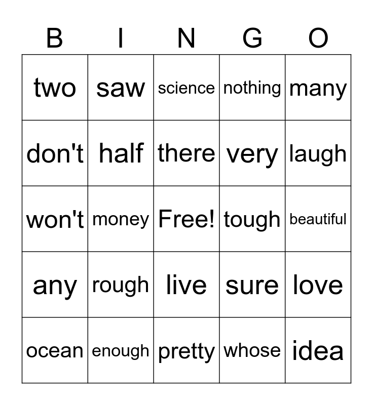 This bingo card has a free space and 29 words: ocean, build, money, honey, two, science, half, rough, tough, enough, beautiful, idea, pretty, whose, laugh, whole, live, any, many, won't, sure, oh, very, don't, nothing, saw, love, there and where.