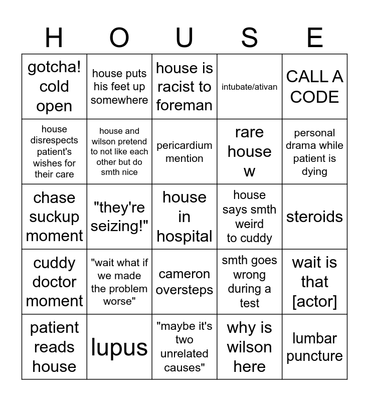 This bingo card has a free space and 24 words: "wait what if we made the problem worse", lupus, pericardium mention, patient reads house, CALL A CODE, gotcha! cold open, house disrespects patient's wishes for their care, house puts his feet up somewhere, house says smth weird to cuddy, cameron oversteps, rare house w, chase suckup moment, smth goes wrong during a test, wait is that [actor], house and wilson pretend to not like each other but do smth nice, why is wilson here, steroids, house is racist to foreman, personal drama while patient is dying, "they're seizing!", lumbar puncture, cuddy doctor moment, intubate/ativan and "maybe it's two unrelated causes".