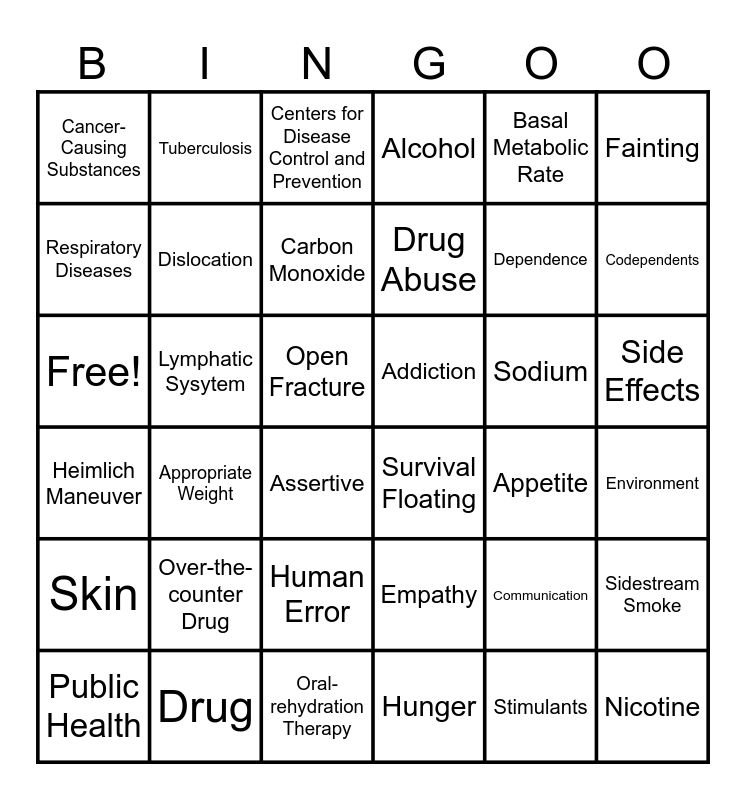 This bingo card has 36 words: Empathy, Human Error, Hunger, Respiratory Diseases, Heimlich Maneuver, Addiction, Dislocation, Oral-rehydration Therapy, Basal Metabolic Rate, Communication, Codependents, Alcohol, Sidestream Smoke, Lymphatic Sysytem, Drug Abuse, Cancer-Causing Substances, Skin, Sodium, Free!, Centers for Disease Control and Prevention, Open Fracture, Appropriate Weight, Survival Floating, Assertive, Appetite, Tuberculosis, Dependence, Drug, Carbon Monoxide, Fainting, Nicotine, Public Health, Environment, Side Effects, Over-the-counter Drug and Stimulants.