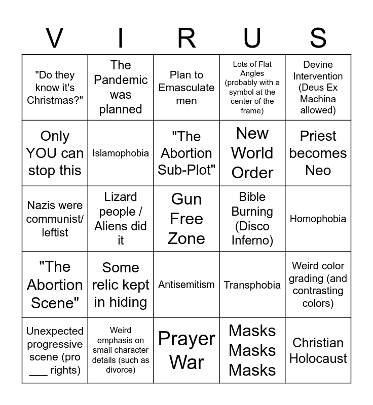 This bingo card has a free space and 24 words: Some relic kept in hiding, Weird emphasis on small character details (such as divorce), "The Abortion Sub-Plot", Unexpected progressive scene (pro ___ rights), Devine Intervention (Deus Ex Machina allowed), "Do they know it's Christmas?", Only YOU can stop this, The Pandemic was planned, Bible Burning (Disco Inferno), Antisemitism, New World Order, Nazis were communist/ leftist, Transphobia, Weird color grading (and contrasting colors), Islamophobia, Masks Masks Masks, Homophobia, Plan to Emasculate men, Priest becomes Neo, Lizard people / Aliens did it, Christian Holocaust, "The Abortion Scene", Lots of Flat Angles (probably with a symbol at the center of the frame) and Prayer War.
