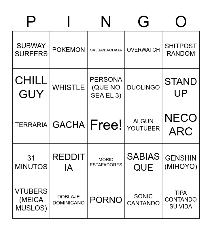 This bingo card has a free space and 24 words: REDDIT IA, DOBLAJE DOMINICANO, PERSONA (QUE NO SEA EL 3), VTUBERS (MEICA MUSLOS), SHITPOST RANDOM, SUBWAY SURFERS, CHILL GUY, POKEMON, ALGUN YOUTUBER, MORID ESTAFADORES, DUOLINGO, TERRARIA, SABIAS QUE, GENSHIN (MIHOYO), WHISTLE, SONIC CANTANDO, NECO ARC, SALSA/BACHATA, STAND UP, GACHA, TIPA CONTANDO SU VIDA, 31 MINUTOS, OVERWATCH and PORNO.