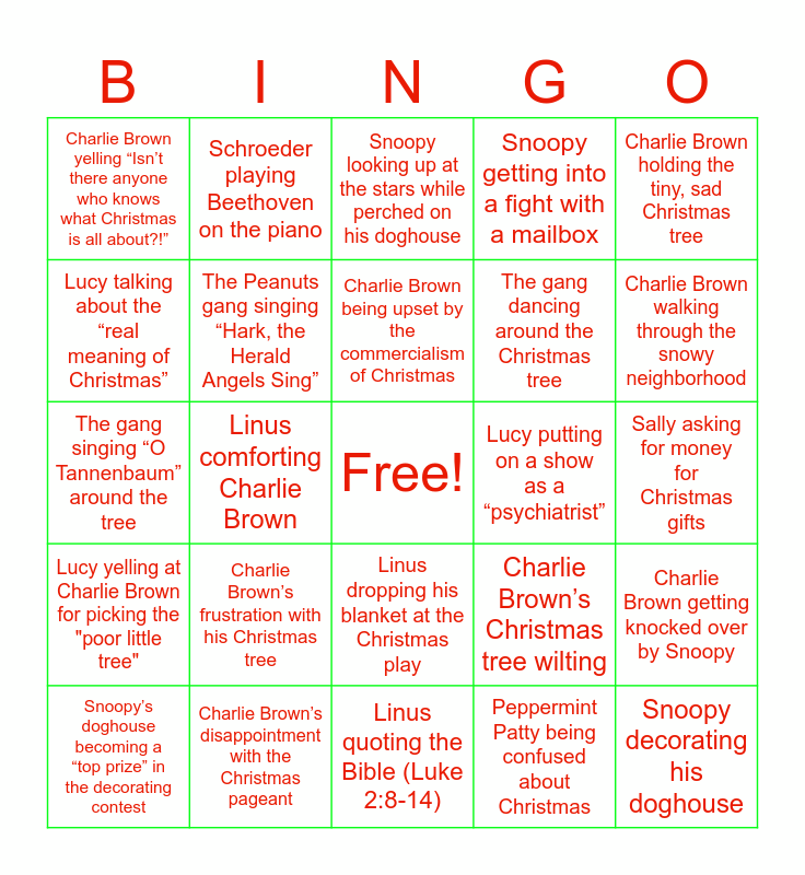 This bingo card has a free space and 49 words: Charlie Brown’s sigh, Snoopy decorating his doghouse, Lucy giving advice for 5 cents, Linus quoting the Bible (Luke 2:8-14), Charlie Brown’s frustration with his Christmas tree, Pigpen’s dust cloud, Schroeder playing Beethoven on the piano, Snoopy wearing a Santa hat, Lucy talking about the “real meaning of Christmas”, Charlie Brown’s classic “Good grief”, The Peanuts gang singing “Hark, the Herald Angels Sing”, Snoopy getting into a fight with a mailbox, Charlie Brown getting knocked over by Snoopy, Charlie Brown’s Christmas tree wilting, Snoopy dressing up in a Christmas-themed costume, Linus carrying his blanket, Charlie Brown being upset by the commercialism of Christmas, Lucy putting on a show as a “psychiatrist”, Snoopy winning a contest for best decorated house, Charlie Brown holding the tiny, sad Christmas tree, Linus comforting Charlie Brown, Peppermint Patty being confused about Christmas, Charlie Brown yelling “Isn’t there anyone who knows what Christmas is all about?!”, The gang dancing around the Christmas tree, Snoopy's dramatic reactions to being ignored, Charlie Brown walking through the snowy neighborhood, Snoopy’s doghouse becoming a “top prize” in the decorating contest, Charlie Brown talking to the tree seller, Linus dropping his blanket at the Christmas play, Lucy yelling at Charlie Brown for picking the "poor little tree", The Peanuts gang singing “Christmas Time Is Here”, Lucy attempting to direct the Christmas play, Snoopy doing a little dance on his doghouse, Linus wrapping his blanket around his shoulders like a cape, Charlie Brown’s disappointment with the Christmas pageant, Snoopy taking a break from his doghouse work to snack, Peppermint Patty calling Charlie Brown “Chuck”, Lucy telling Charlie Brown his tree is too "small", Sally asking for money for Christmas gifts, Charlie Brown “tossing” the sad Christmas tree in frustration, The gang throwing a snowball at Charlie Brown, Linus getting upset with the other kids during the Christmas play rehearsal, Snoopy peeking out from behind his doghouse, Charlie Brown being surrounded by the Peanuts gang and looking bewildered, The gang singing “O Tannenbaum” around the tree, Snoopy looking up at the stars while perched on his doghouse, Lucy being bossy to Schroeder during the Christmas play, Charlie Brown receiving a letter from Lucy asking for gifts and Charlie Brown exclaiming "I never thought it was such a bad little tree!".
