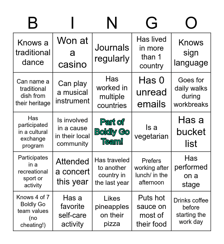 This bingo card has a free space and 35 words: Has worn traditional attire from another country, Has a name with religious or cultural significance, Can speak 2 or more languages, Can play a musical instrument, Has traveled to another country in the last year, Has lived in more than 1 country, Can name a traditional dish from their heritage, Has had their name mispronounced, Has worked in multiple countries, Still lives in their hometown, Has participated in a cultural exchange program, Knows sign language, Celebrated a holiday or festival from a different culture, Listens to music in other languages, Knows a traditional dance, Is a vegetarian, Puts hot sauce on most of their food, Is involved in a cause in their local community, Participates in a recreational sport or activity, Drinks coffee before starting the work day, Prefers working after lunch/ in the afternoon, Knows 4 of 7 Boldly Go team values (no cheating!), Has performed on a stage, Has a favorite self-care activity, Journals regularly, Goes for daily walks during workbreaks, Has taken a yoga or pilates class, Got 7-8 hours of sleep last night, Has 0 unread emails, Has a bucket list, Has taken a dance class, Likes pineapples on their pizza, Attended a concert this year, Won at a casino and Has an unusual family tradition.