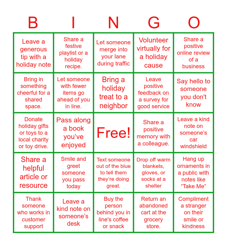 This bingo card has a free space and 24 words: Smile and greet someone you pass today, Leave a kind note on someone’s desk, Bring a holiday treat to a neighbor, Thank someone who works in customer support, Share a positive online review of a business, Leave a generous tip with a holiday note, Bring in something cheerful for a shared space., Share a festive playlist or a holiday recipe., Share a positive memory with a colleague., Text someone out of the blue to tell them they’re doing great., Leave positive feedback on a survey for good service, Donate holiday gifts or toys to a local charity or toy drive., Drop off warm blankets, gloves, or socks at a shelter, Hang up ornaments in a public with notes like “Take Me”, Let someone with fewer items go ahead of you in line., Return an abandoned cart at the grocery store., Leave a kind note on someone’s car windshield, Let someone merge into your lane during traffic, Say hello to someone you don't know, Pass along a book you’ve enjoyed, Compliment a stranger on their smile or kindness, Share a helpful article or resource, Volunteer virtually for a holiday cause and Buy the person behind you in line's coffee or snack.