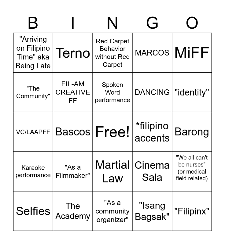 This bingo card has a free space and 24 words: "As a Filmmaker", The Academy, Spoken Word performance, Selfies, MiFF, "Arriving on Filipino Time" aka Being Late, "The Community", Terno, *filipino accents, Martial Law, DANCING, VC/LAAPFF, Cinema Sala, "We all can't be nurses” (or medical field related), FIL-AM CREATIVE FF, "Isang Bagsak", Barong, Red Carpet Behavior without Red Carpet, "identity", Bascos, "Filipinx", Karaoke performance, MARCOS and "As a community organizer".