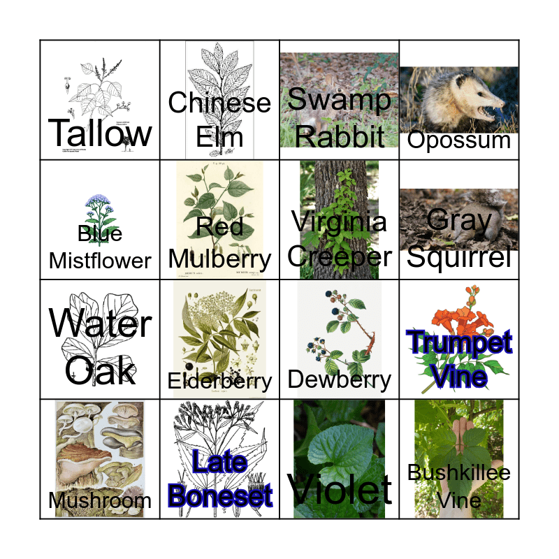 This bingo card has 16 images and 16 words: Late Boneset, Trumpet Vine, Swamp Rabbit, Tallow, Water Oak, Chinese Elm, Dewberry, Violet, Blue Mistflower, Red Mulberry, Mushroom, Opossum, Elderberry, Gray Squirrel, Virginia Creeper and Bushkillee Vine.