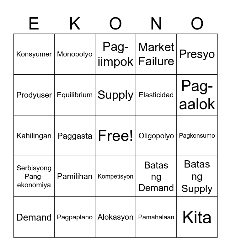 This bingo card has a free space and 25 words: Pamilihan, Alokasyon, Supply, Demand, Presyo, Konsyumer, Prodyuser, Monopolyo, Oligopolyo, Kompetisyon, Elasticidad, Kahilingan, Batas ng Demand, Batas ng Supply, Equilibrium, Pagtitipid, Pagkonsumo, Pag-iimpok, Pag-aalok, Paggasta, Kita, Pagpaplano, Serbisyong Pang-ekonomiya, Market Failure and Pamahalaan.