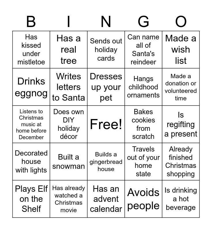 This bingo card has a free space and 27 words: Travels out of your home state, Goes caroling, Hangs childhood ornaments, Has an advent calendar, Drinks eggnog, Sends out holiday cards, Has a real tree, Decorated house with lights, Bakes cookies from scratch, Already finished Christmas shopping, Listens to Christmas music at home before December, Can name all of Santa's reindeer, Plays Elf on the Shelf, Has already watched a Christmas movie, Made a donation or volunteered time, Can't keep gifts a secret, Writes letters to Santa, Dresses up your pet, Built a snowman, Has kissed under mistletoe, Is regifting a present, Avoids people, Does own DIY holiday décor, Is drinking a hot beverage, Builds a gingerbread house, Made a wish list and Has snow on the ground.