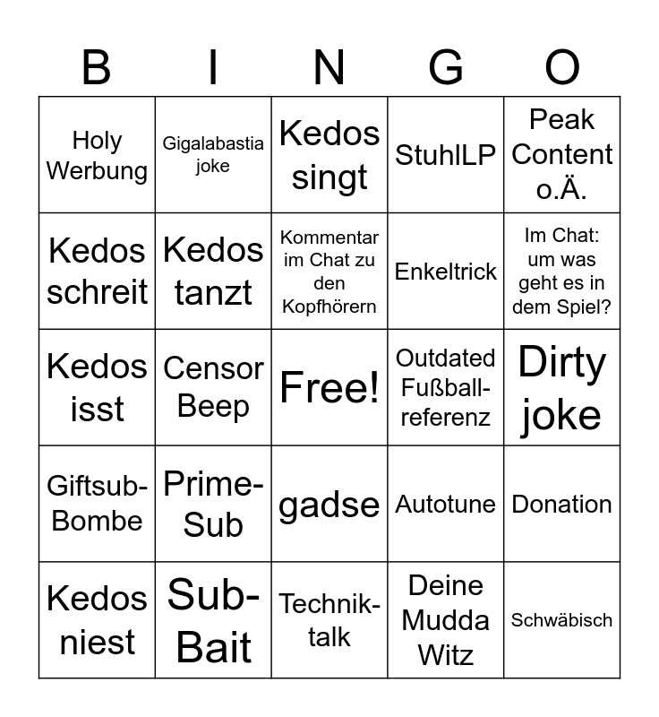 This bingo card has a free space and 31 words: Technik- talk, Hall Voice-Effekt, Censor Beep, Gisela/ Steven, Holy Werbung, Kedos singt, Kedos tanzt, Autotune, Outdated Fußball- referenz, Deine Mudda Witz, Dirty joke, Schwäbisch, Kedos spricht in irgend- einem Dialekt (außer schwä- bisch), Im Chat: wie lang geht der Stream noch?, Im Chat: um was geht es in dem Spiel?, Kedos mobbt jemanden im Chat, Donation, Prime-Sub, Giftsub-Bombe, gadse, Peak Content o.Ä., Kedos ist verwirrt, Kedos niest, Gigalabastia joke, Enkeltrick, Kedos schreit, StuhlLP, Kedos isst, Sub-Bait, Kommentar im Chat zu den Kopfhörern and Jemand im Chat hat Kedos wieder-gefunden.