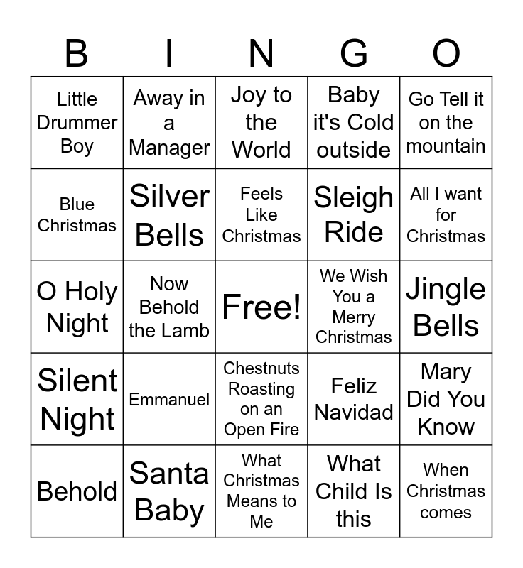 This bingo card has a free space and 24 words: Behold, Emmanuel, Feels Like Christmas, What Child Is this, Go Tell it on the mountain, Little Drummer Boy, Away in a Manager, Joy to the World, We Wish You a Merry Christmas, Jingle Bells, O Holy Night, Silver Bells, Feliz Navidad, Mary Did You Know, Blue Christmas, Santa Baby, What Christmas Means to Me, Baby it's Cold outside, All I want for Christmas, Silent Night, Now Behold the Lamb, Chestnuts Roasting on an Open Fire, Sleigh Ride and When Christmas comes.