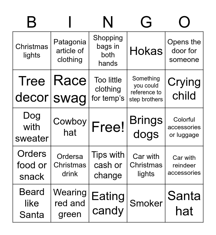 This bingo card has a free space and 24 words: Ordersa Christmas drink, Wearing red and green, Too little clothing for temp’s, Beard like Santa, Opens the door for someone, Christmas lights, Tree decor, Patagonia article of clothing, Brings dogs, Tips with cash or change, Something you could reference to step brothers, Dog with sweater, Car with Christmas lights, Car with reindeer accessories, Race swag, Smoker, Colorful accessories or luggage, Shopping bags in both hands, Crying child, Cowboy hat, Santa hat, Orders food or snack, Hokas and Eating candy.