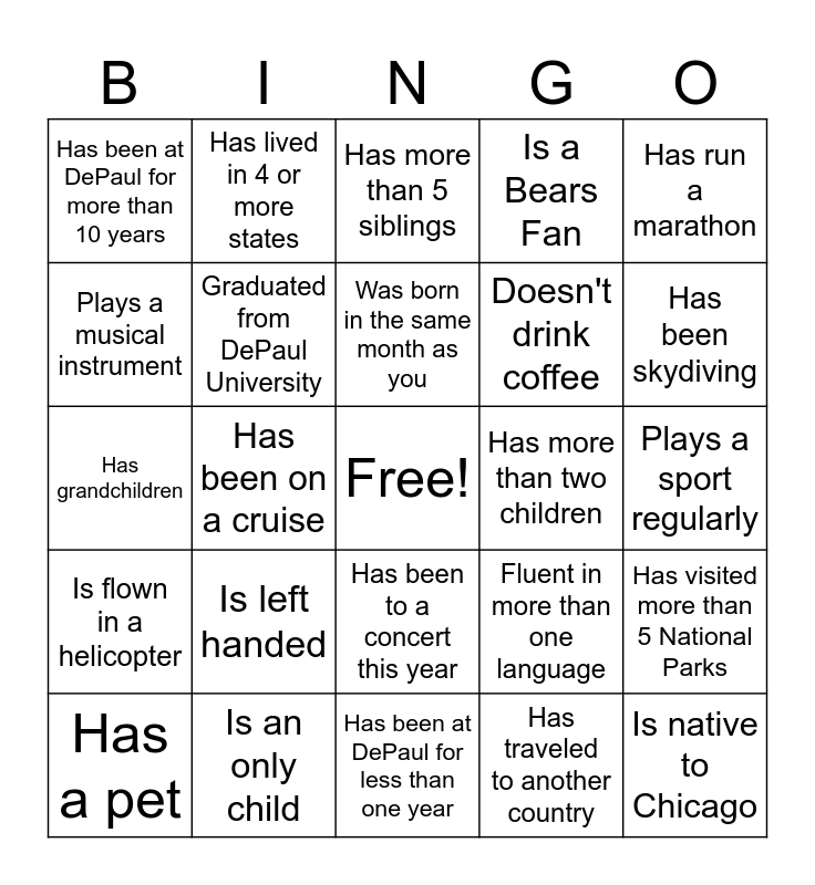 This bingo card has a free space and 24 words: Is left handed, Is an only child, Was born in the same month as you, Has a pet, Has run a marathon, Has been at DePaul for more than 10 years, Plays a musical instrument, Has lived in 4 or more states, Has more than two children, Has been to a concert this year, Doesn't drink coffee, Has grandchildren, Fluent in more than one language, Has visited more than 5 National Parks, Graduated from DePaul University, Has traveled to another country, Plays a sport regularly, Has more than 5 siblings, Has been skydiving, Has been on a cruise, Is native to Chicago, Is flown in a helicopter, Is a Bears Fan and Has been at DePaul for less than one year.